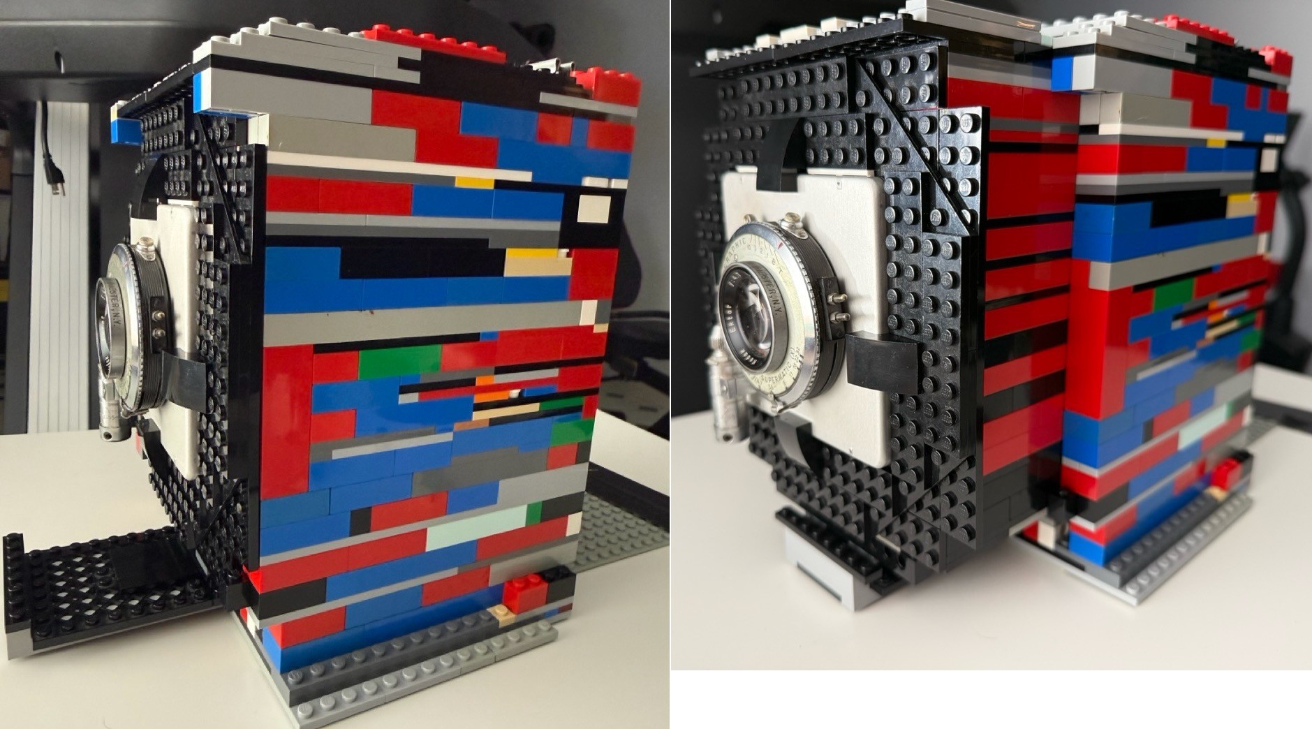 I realized I never shared any images of the LEGO Technica v2 itself, so here it is. "Bellows" extended vs not, ground (focusing) glass slotted in vs a film holder slotted in, setting up the shot, and what it looks like through the ground glass with shutter open.I believe I've taken care of the light leaks around the front standard (vs v1), but now there are a couple of light leaks around the top of the film holder/glass slot. Those should be easy to resolve without needing to fully rebuild the camera again though. #photography #filmphotography #largeformat #4x5 #LEGO #believeinfilm