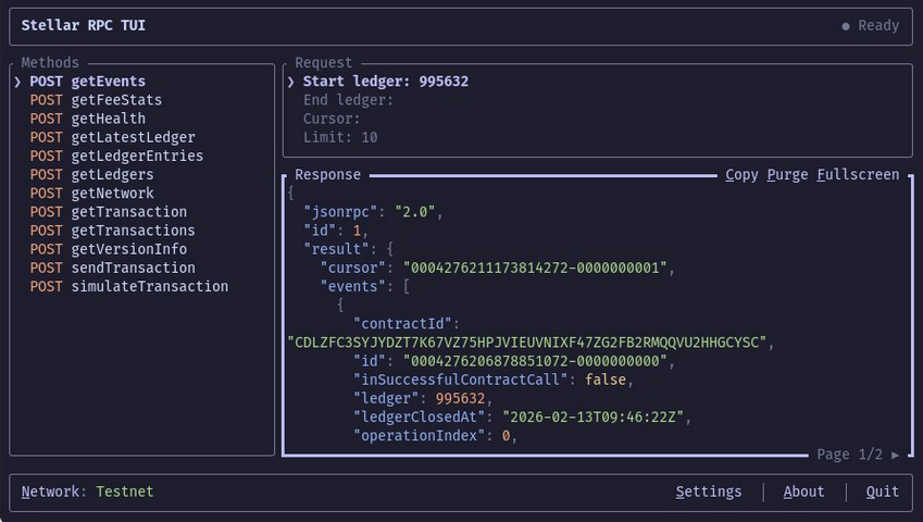 Exploring blockchain RPCs from the terminal **stellar-tui** — Discover & execute Stellar RPC methods. Structured forms, response pagination, regex search & endpoint management. Written in Rust & built with @ratatui_rs GitHub: https://github.com/padparadscho/stellar-tui#rustlang #ratatui #tui #stellar #soroban #blockchain #cli #devtools