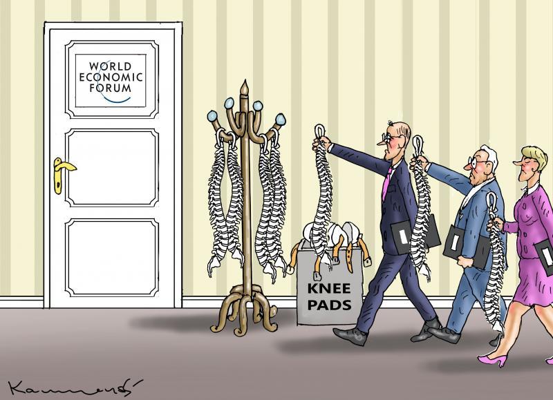 @Maria1958 Uma ilustração em quadrinhos retrata uma sala com uma porta branca marcada "WORLD ECONOMIC FORUM" em um painel retangular, com uma maçaneta dourada. À direita da porta, um armário de couros armazena vários tênis pretos e brancos, e um lixo cinza marcado "KNEE PADS" contém mais tênis pretos. Três pessoas caminham: uma vestida em um azul escuro com um laço rosa, outra em um azul claro, e a terceira usando um figurino roxo, cada uma segurando um tênis. O fundo possui listras amarelas verticais.Fornecido por @altbot, gerado localmente e de forma privada usando Qwen3-Vl:30b Energia utilizada: 0.090 Wh