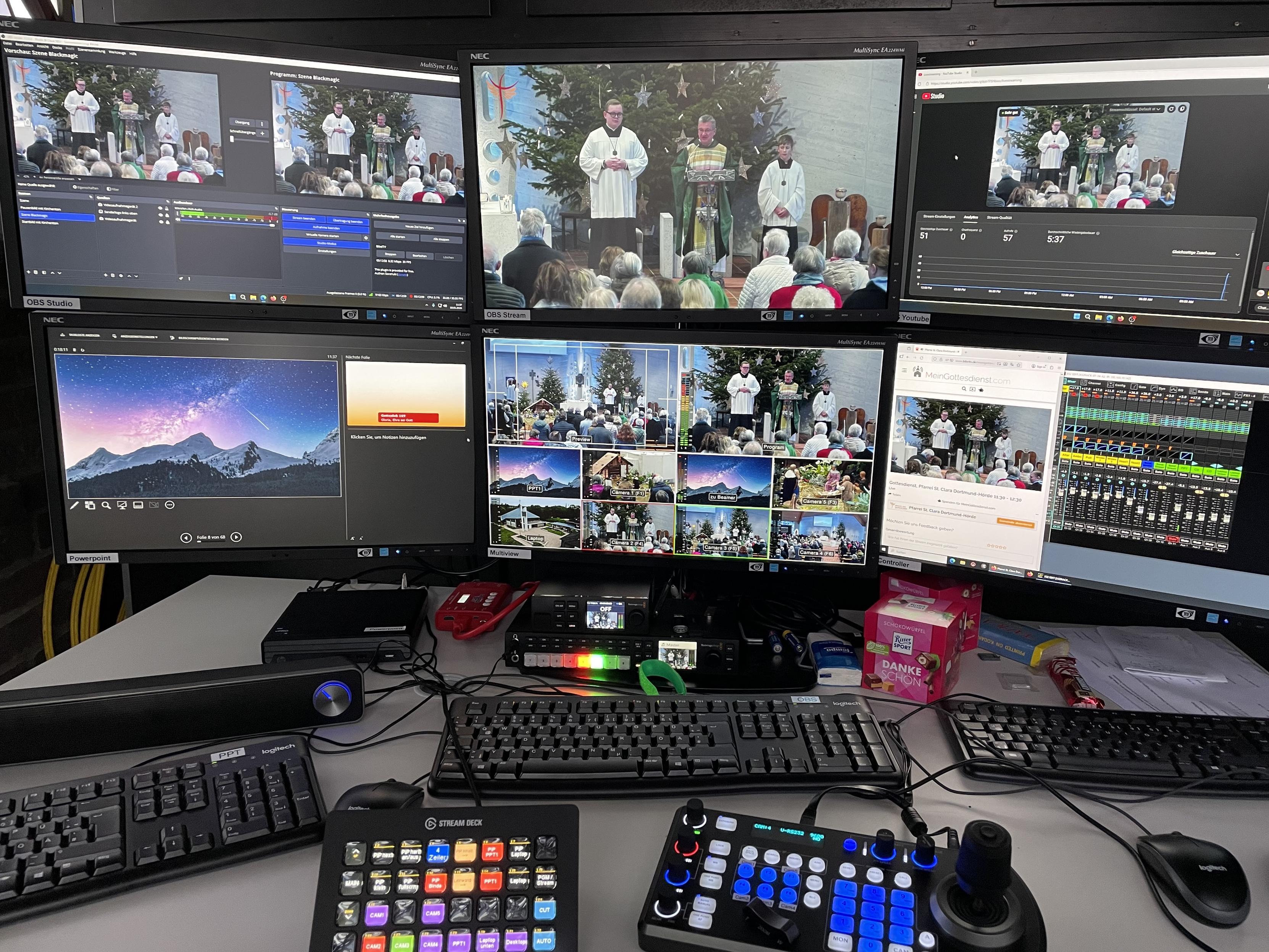 @KatholischeKircheAmPhoenixsee Ein Schreibtisch mit einer Ausstattungsgruppe aus sechs Computermonitoren, die verschiedene Videoproduktionsschnittstellen anzeigen, umgeben von Eingabegeräten und Ausrüstung. Aufsteigend, zeigen die obersten Monitore: links – Videobearbeitungssoftware mit Zeitachse und einer Szene von Menschen; mittig – eine Live-Übertragung eines Gruppen von Personen mit weißen Roben (einer hält ein Dokument) und einer Zuschauermenge; rechts – ein weiteres Videobearbeitungs-View mit Zeitachsen. Absteigend, zeigen die unteren Monitore: links – ein Landschaftsbild aus Bergen und Himmel; mittig – ein Raster mit mehreren Videofeeds (selbes Ereignis); rechts – ein Browserfenster mit einer Videomixer-Oberfläche. Unter den Monitoren hält der Schreibtisch zwei Tastaturen, einen Stream Deck mit farbigen Knöpfen, einen Kontrollpanel mit blauen Knöpfen und einem Mauspad, sowie kleine Gegenstände wie eine rosa Box und Kabel.Bereitgestellt von @altbot, privat und lokal generiert mit Qwen3-Vl:30b Energieverbrauch: 0.124 Wh