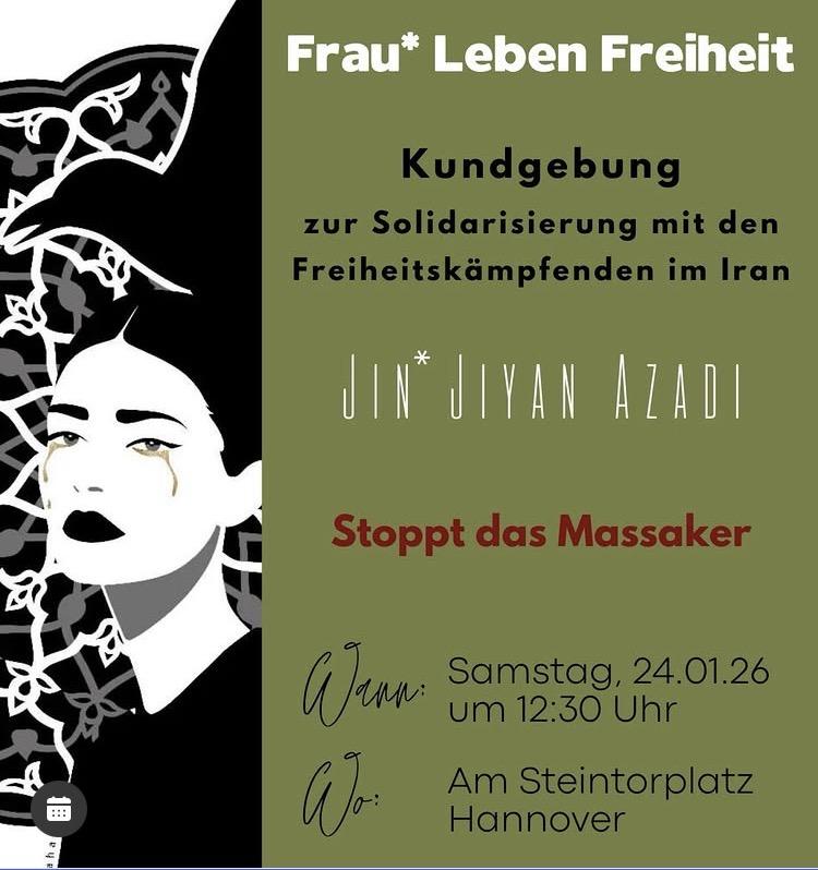 via hanover_for_iran Diesen Samstag versammeln wir uns erneut zur Solidarisierung mit den Freiheitskämpfenden im Iran.Kundgebung am 24.01.2026, Start um 12:30 UhrSteintorplatz, Hannover.#HanoverForIran #FreeIran #JinJiyanAzadî