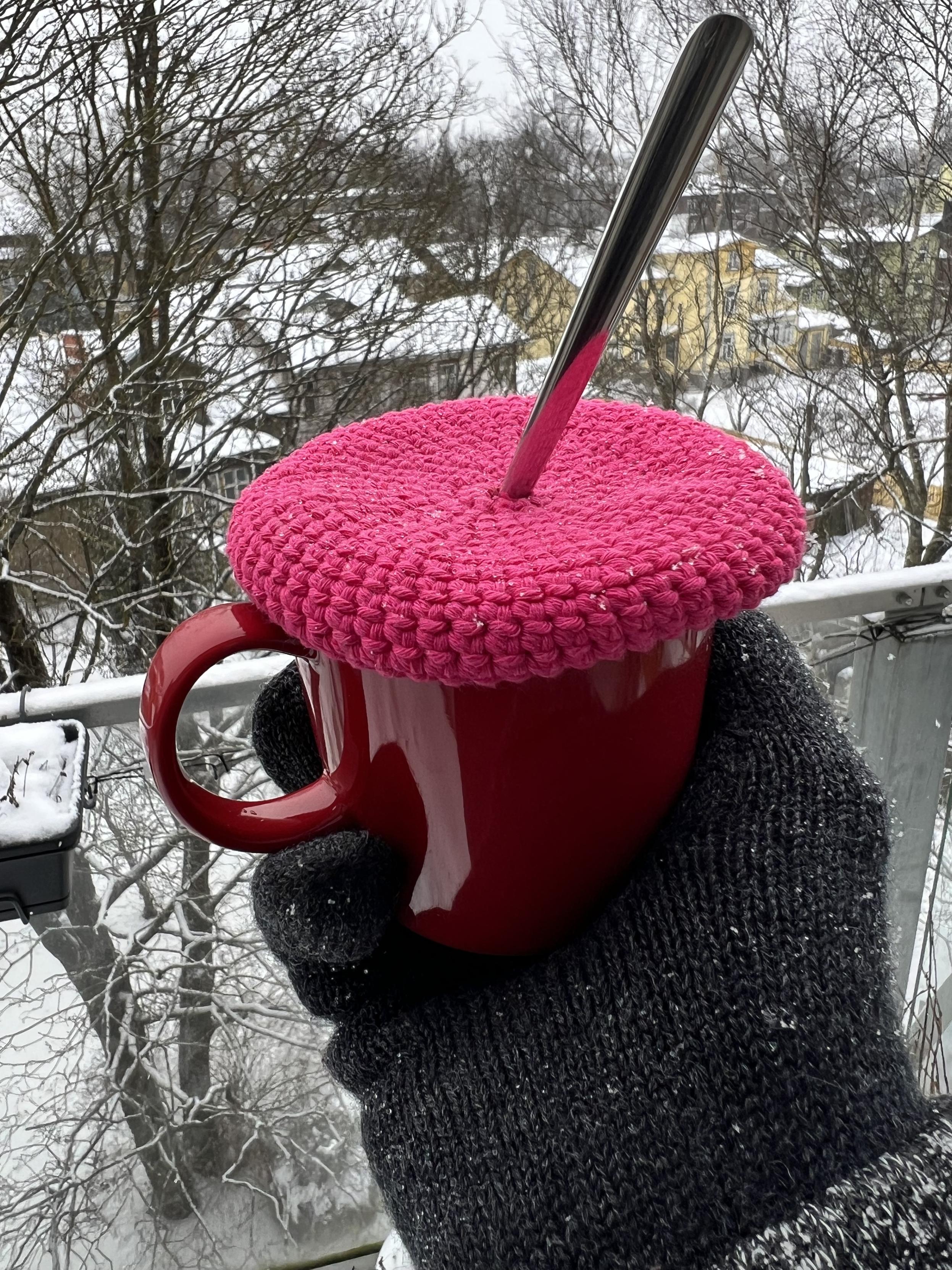 Auch wenn’s schneit - Kaffee auf dem Balkon morgens muss schon sein 😁 die Frau hat das was gehäkelt.