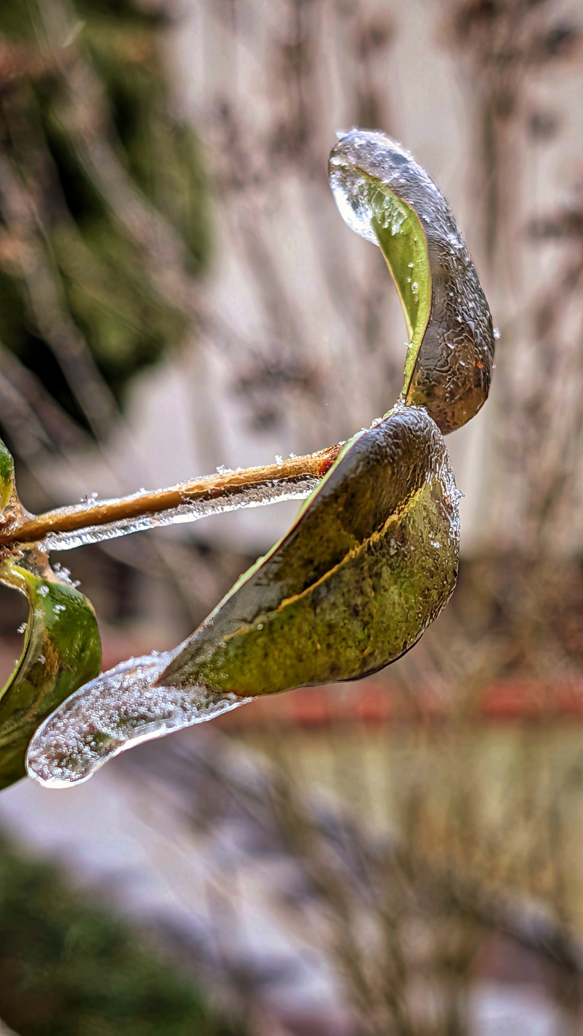 @BerlinMatze Ein Nahaufnahme eines Pflanzenteils mit grünen Blättern bedeckt mit Eiskristallen, gegen einen verschwommenen Hintergrund im Freien. Die Blätter und der Stamm haben dicke Schichten aus klarer Eiskristallbildung mit sichtbaren Frost und Tropfen. Einige Blätter zeigen Grün mit bräunlichen Flecken, und die Eiskristalle erzeugen eine transparente, glänzende Erscheinung. Der Hintergrund umfasst verschwommene Strukturen und Bäume, die auf einen Garten oder ein Wohngebiet hindeuten. Die Eiskristalle auf dem Pflanze deuten auf kalte Wetterbedingungen wie Gefrorene Regen oder Schneegefälle hin.Bereitgestellt von @altbot, privat und lokal generiert mit Qwen3-Vl:30b Energieverbrauch: 0.104 Wh