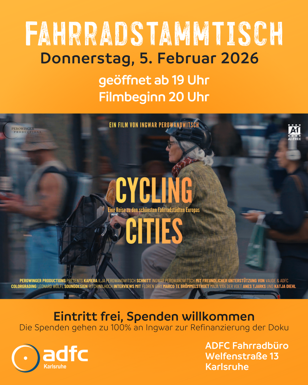 Schon mal in den Kalender eintragen: Beim nächsten #FahrradStammtisch zeigen wir die neue Doku "Cycling Cities" von Ingwar Perowanowitsch @Perowinger94