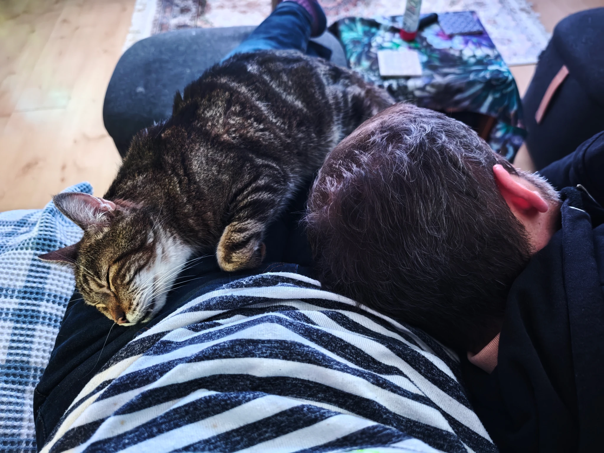 Jetzt liegen zwei Rotznasen auf meinen Beinen. Nun, einen Vorteil müssen dicke Schenkel ja haben :blobcatlaugh: -