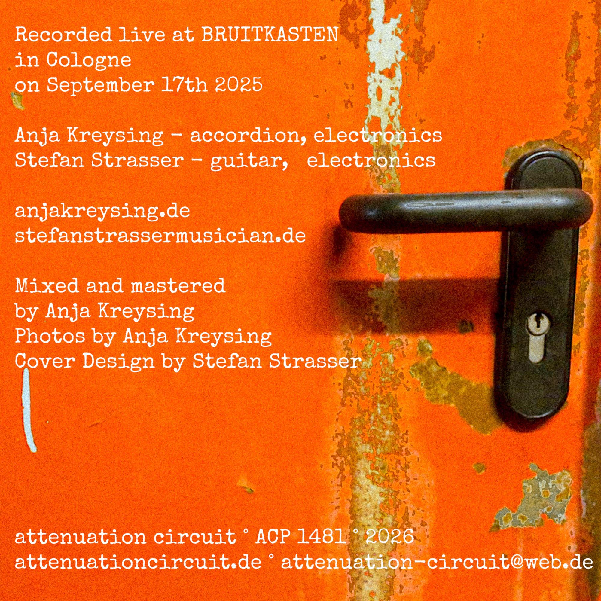 Anja Kreysing ( #accordion & #electronics) and Stefan Strasser ( #guitar & #electronics ) navigate dense sonic geographies of abstract texture and harmonic traces, where signals erode, tonal fragments emerge and disappear, and noise moves like weather across concrete structures.
