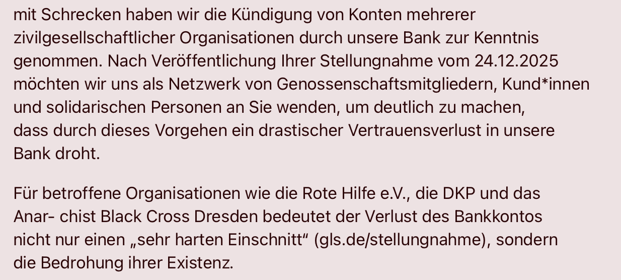Das war harte Arbeit! Aber jetzt ist es öffentlich. Der offene Brief an den Vorstand der #GLS-Bank gegen das #Debanking linker Organisationen. Ihr könnt alle auch unterschreiben, so wie es schon 130 Organisationen, 1508 Genossenschaftsmitglieder, 1440