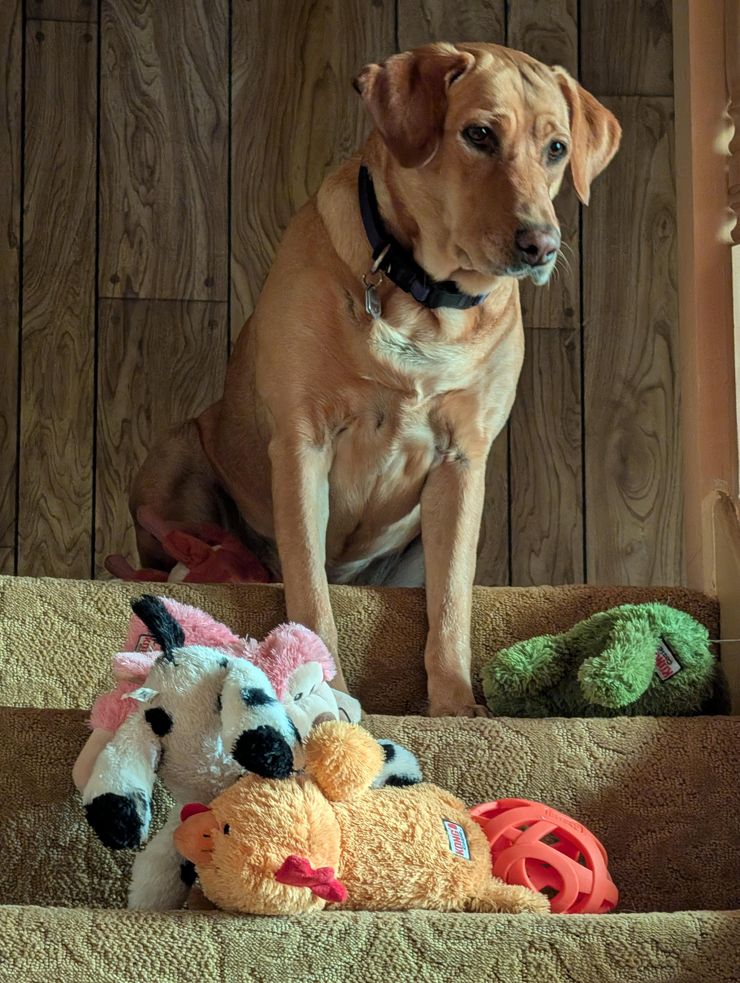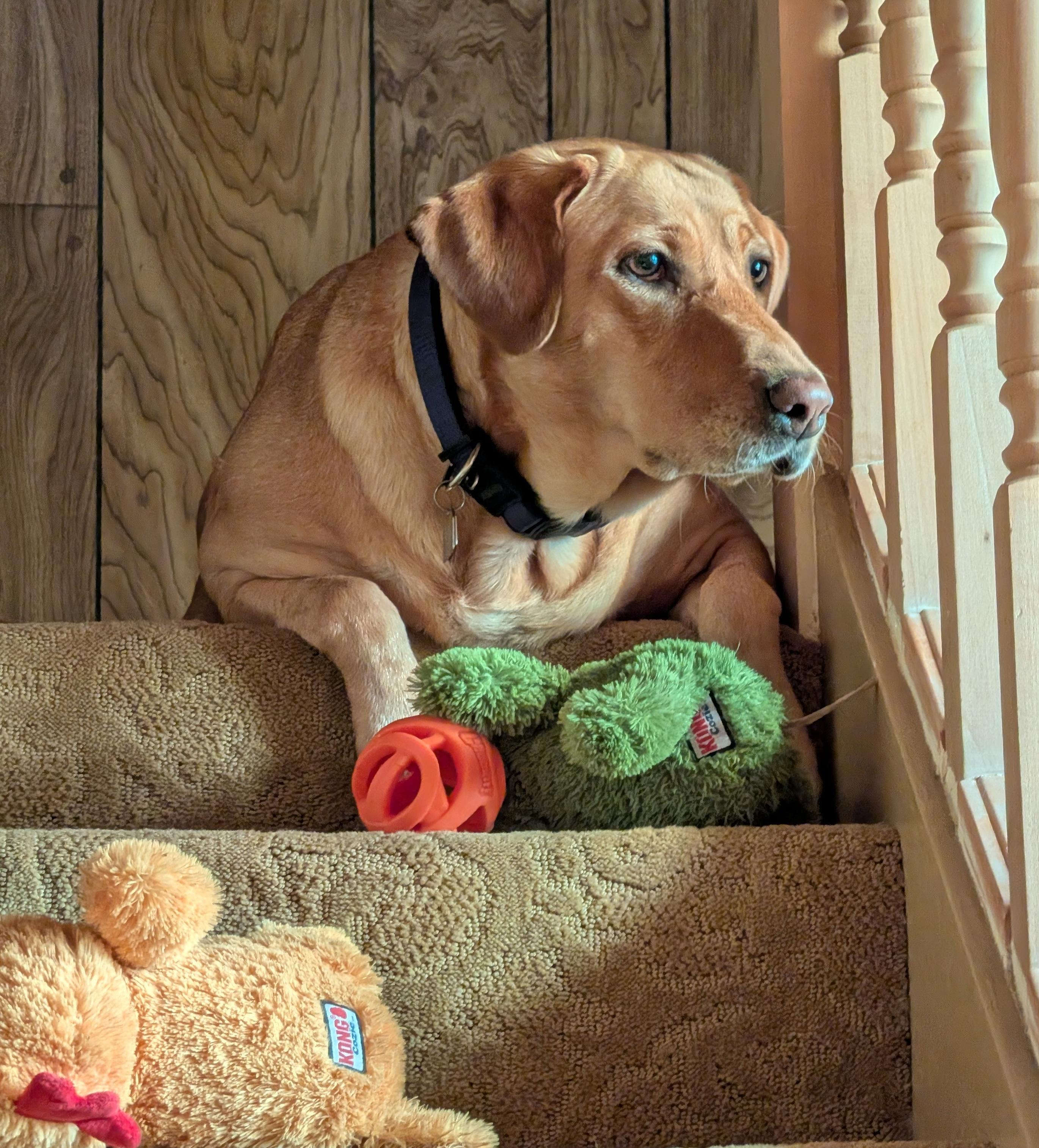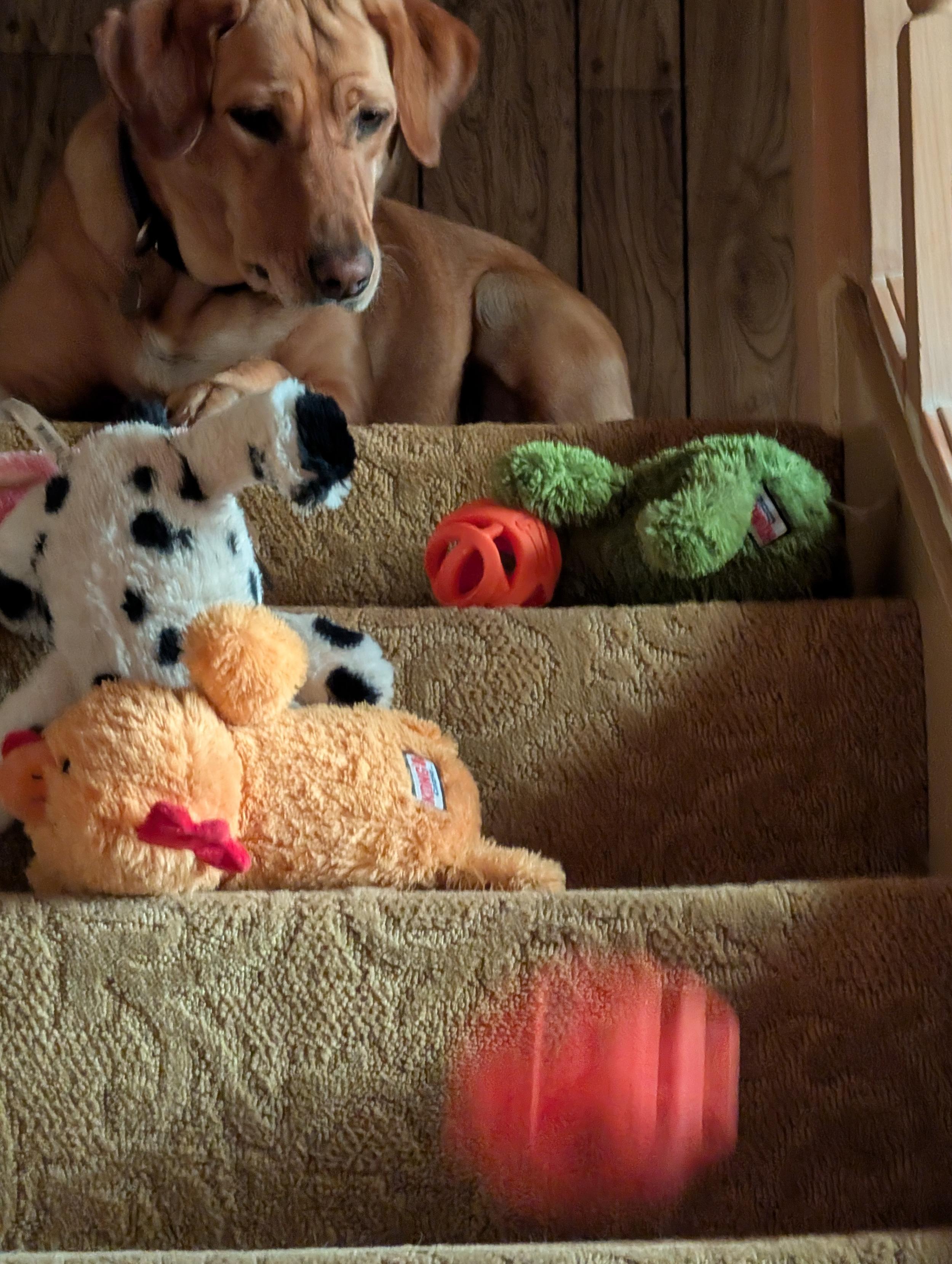 The after breakfast lull was happening so Summer started running up the stairs with her toys. I'm pretty sure she has a plan.