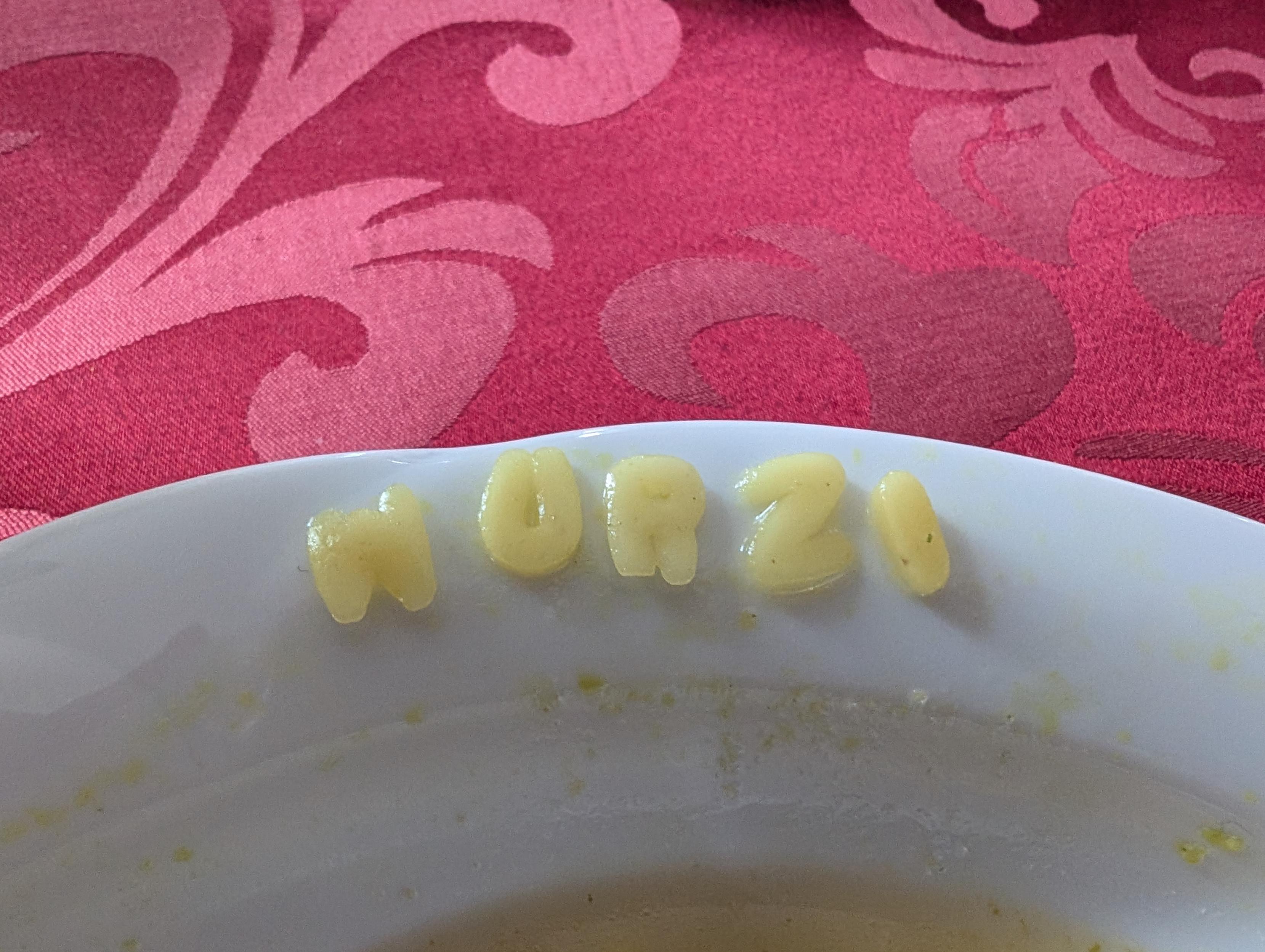 Mein kleiner Neffe hat sich für heute Buchstaben-Suppe gewünscht. Ausgezeichnete Wahl, großer Spaß, 10/10.