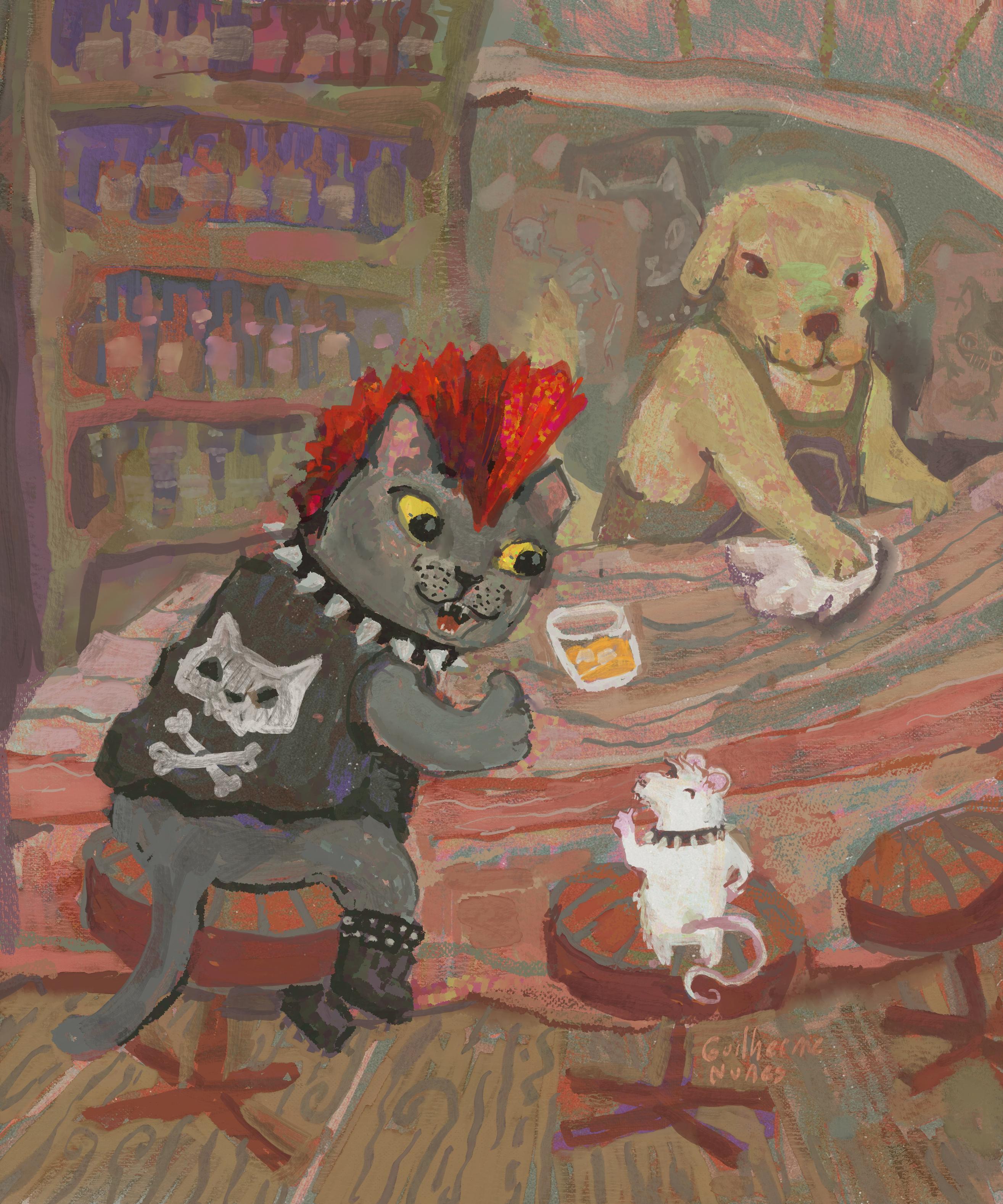 Punk cat socializing with locals and forming a real sense of community (commission)