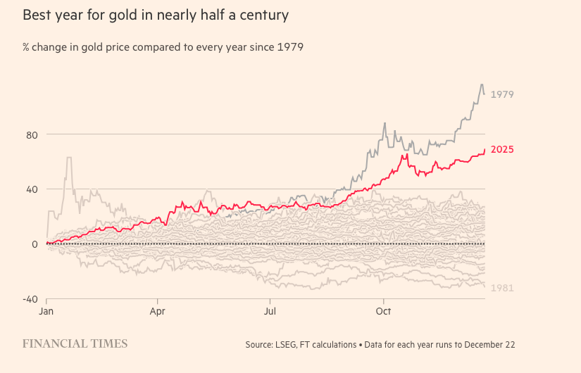 If surging gold prices indicate concerns elsewhere in the global economy then the fact that gold has had its 'best year' (in terms of % price increases) since 1979, might be yet one more indicator that the AI bubble is approaching a bursting point...But, equally optimists might argue that it was another eight years before a financial crisis hit after 1979's gold surge, so there's plenty of time for AI-related speculative gains yet...A Christmas conundrum for us?#AI #FinancialCrisis