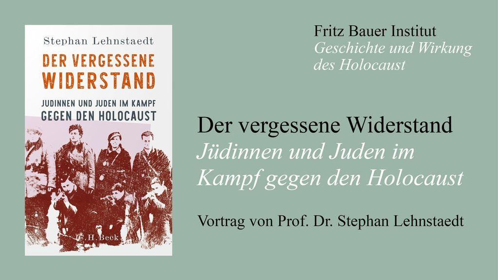 VortragDer vergessene Widerstand – Jüdinnen und Juden im Kampf gegen den HolocaustMit Prof. Dr. Stephan LehnstaedtÜber jüdischen Widerstand, Überleben und Selbstbehauptung im NS-Staat und den besetzten Gebieten. 28.01.2026 | 18:15 Uhr Campus Westend, Casino-Gebäude, Raum 1.811 https://www.fritz-bauer-institut.de/veranstaltungen/veranstaltung/der-vergessene-widerstand