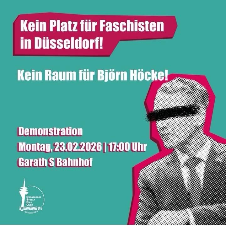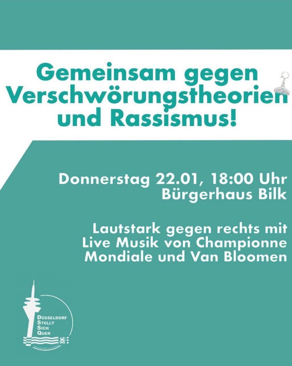 @Omas_gegen_Rechts_Duesseldorf Ein Poster mit einer teal- und weißen Farbpalette. Der obere Abschnitt zeigt teal text: „Gemeinsam gegen Verschwörungstheorien und Rassismus!“. Unterhalb, auf einem teal-background, weißer Text lautet: „Donnerstag 22.01, 18:00 Uhr Bürgerhaus Bilk” und „Lautstark gegen rechts mit Live Musik von Champione Mondiale und Van Bloemen“. Im unteren linken Eck ein weißes Logo, das den Text „Dusseldorf Stellt Sich Quer” mit einer Silhouette von einem Turm und wellenförmigen Linien enthält. Im oberen rechten Eck ein kleines weißes Icon.Bereitgestellt von @altbot, privat und lokal generiert mit Qwen3-Vl:30b Energieverbrauch: 0.102 Wh