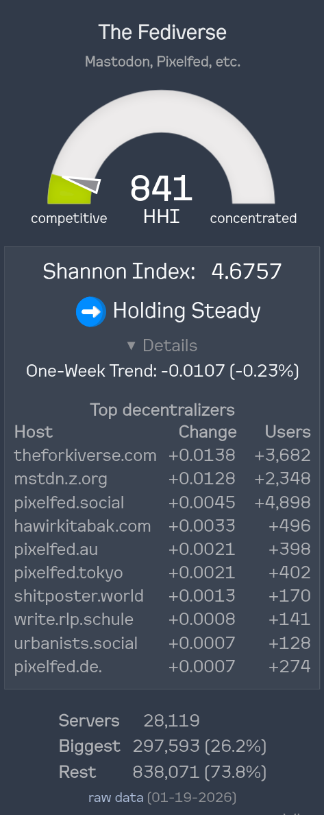 More new features in https://arewedecentralizedyet.online/ because apparently this is what I do for fun now.There's a 'details' flippy thing (or 'disclosure triangle', if you prefer to live a joyless existence) that lists the sites that are contributing the most towards decentralization - mostly, by growing, though it's possible for the largest sites to contribute by shrinking.Also, we can have an in-browser viewer for the raw CSV data, as a treat